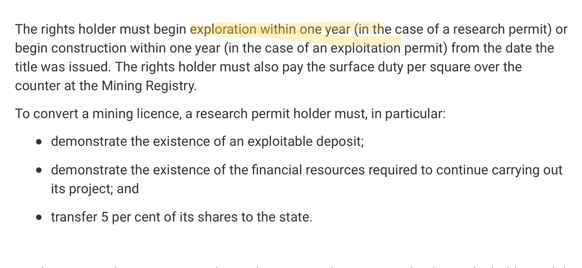 These have also been hard-written into the AVZ / Dathcom SAS / Cominiere 2017 joint venture agreement also (at least in respect to the fact that financing must be sought). This comes from the official JV agreement amendment 2017. I have processed and translated the clause so that people do not have to learn French: It sounds simple, it took hours to translate this document from not quite straight scans of agreement pages.The deal is that you commence exploration within the first year ; doing nothing for the first 3 years doesn't fit the bill.