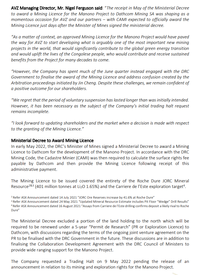 Cut & Copy that and email it to Nige or post to AVZ OfficeCome the 15/8 we’ve been in suspension for 14 F***ing Weeks & still nothing from Nigel (is he still around) or the ASX for a please explain for we are a top 200 ASX company .Back in Dec/Jan ,Nigel stated it was only a matter of days before a ML was to be granted …why arent we trading …accordingly we own anywhere between 51-75% …our money is tied up for what reason …We need the cold hard facts ,i think we deserve it …Lit stocks are starting to rise now …thanks for saving us on the slump but if we hold majority % why arent we trading …Sorry im a simplistic /patient person but my PATIENCE has worn awfully thin.FFS Nigel come out from under that rock you’ve been hiding & lead from the front ,we’re adults and can handle the truth…Rant over![]()