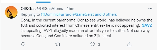 Can someone care to explain what is being said here? So even after the sale of the 15% to AVZI, Cong was soliciting interests from chinese entities on that same 15%? And what's this offer AVZI made if legitimately own the 15%? I'd be telling Cong to F off.