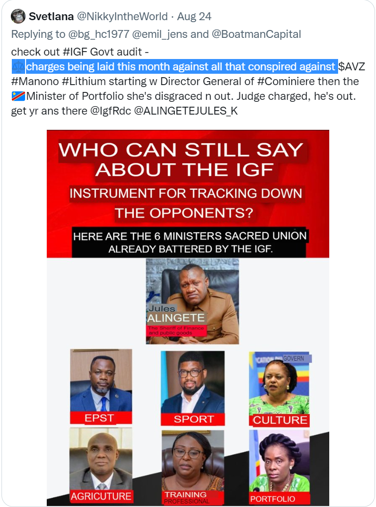 Solo, your question has two parts, as I’ve said I don’t want to spend time on these threads, but I’ve attached a Link where the IGF accuses Adele Kayinda of complicity in regard to Cominiere’s selling to Zigin. I admit, I think from memory the sacking of Kayinda was said through twitter posts on these threads from sources I believe are reliable along with photos of her at the recent meeting of ministers where she has a ‘Visitor’s’ tag on her dress. The MoM (Antoinette) I believe instructs CAMI and my previous research found the Finance Minister also instructs CAMI. Hope you can follow up on theses because if I spend more time here I’m either going to start making sarcastic comments again or swearing my fucken head off again. Anything you can dig up will no doubt be appreciated https://exclusifrdc.com/le-bradage-...-sest-fait-avec-la-complicite-dadele-kayinda/