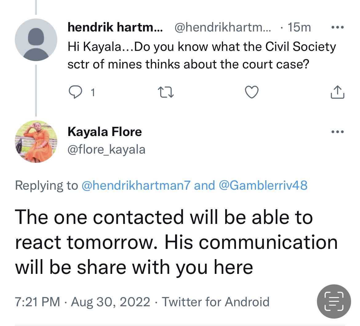 Solo, your question has two parts, as I’ve said I don’t want to spend time on these threads, but I’ve attached a Link where the IGF accuses Adele Kayinda of complicity in regard to Cominiere’s selling to Zigin. I admit, I think from memory the sacking of Kayinda was said through twitter posts on these threads from sources I believe are reliable along with photos of her at the recent meeting of ministers where she has a ‘Visitor’s’ tag on her dress. The MoM (Antoinette) I believe instructs CAMI and my previous research found the Finance Minister also instructs CAMI. Hope you can follow up on theses because if I spend more time here I’m either going to start making sarcastic comments again or swearing my fucken head off again. Anything you can dig up will no doubt be appreciated https://exclusifrdc.com/le-bradage-...-sest-fait-avec-la-complicite-dadele-kayinda/
