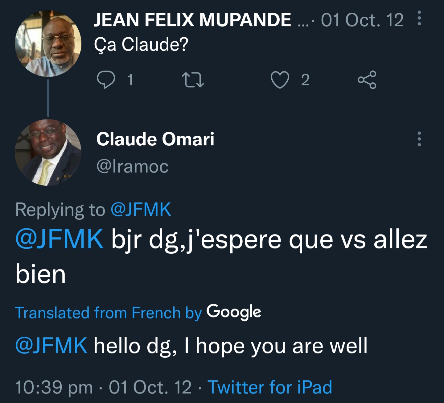 The question is who is this @Iramoc (Claude Omari) account more likely to have been messaging back in 2012. Either it is Jean Mupande or it is the Director General of Cominiere (I think it's Célestin Kabemba but not sure) that has changed his user name and handle to try and discredit AVZ imo