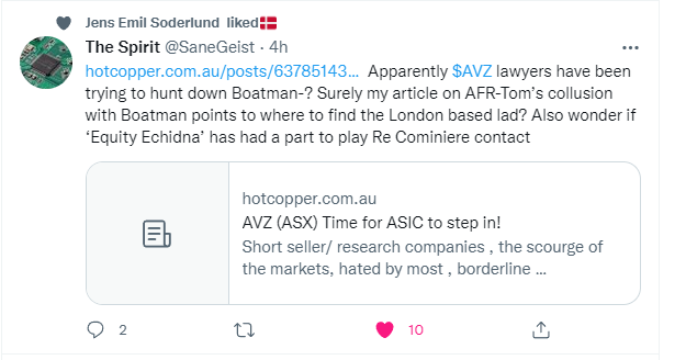 2nd this, only alternate universe this matters one fucking iota is the universe where we have an ML already, tied up the extra 15% or so and are building the mine in partnership with CATH……then only then is it worth looking at that sad little cretinous dingy boy and his lame limp-dick attempt at shorting us. Priorities first, then playtime!!!I don’t understand this boatman drama, yes it was bullshit but does it matter in current situation… no.. who gives a flying fuck move on. All energy and time should be into resolving current issues