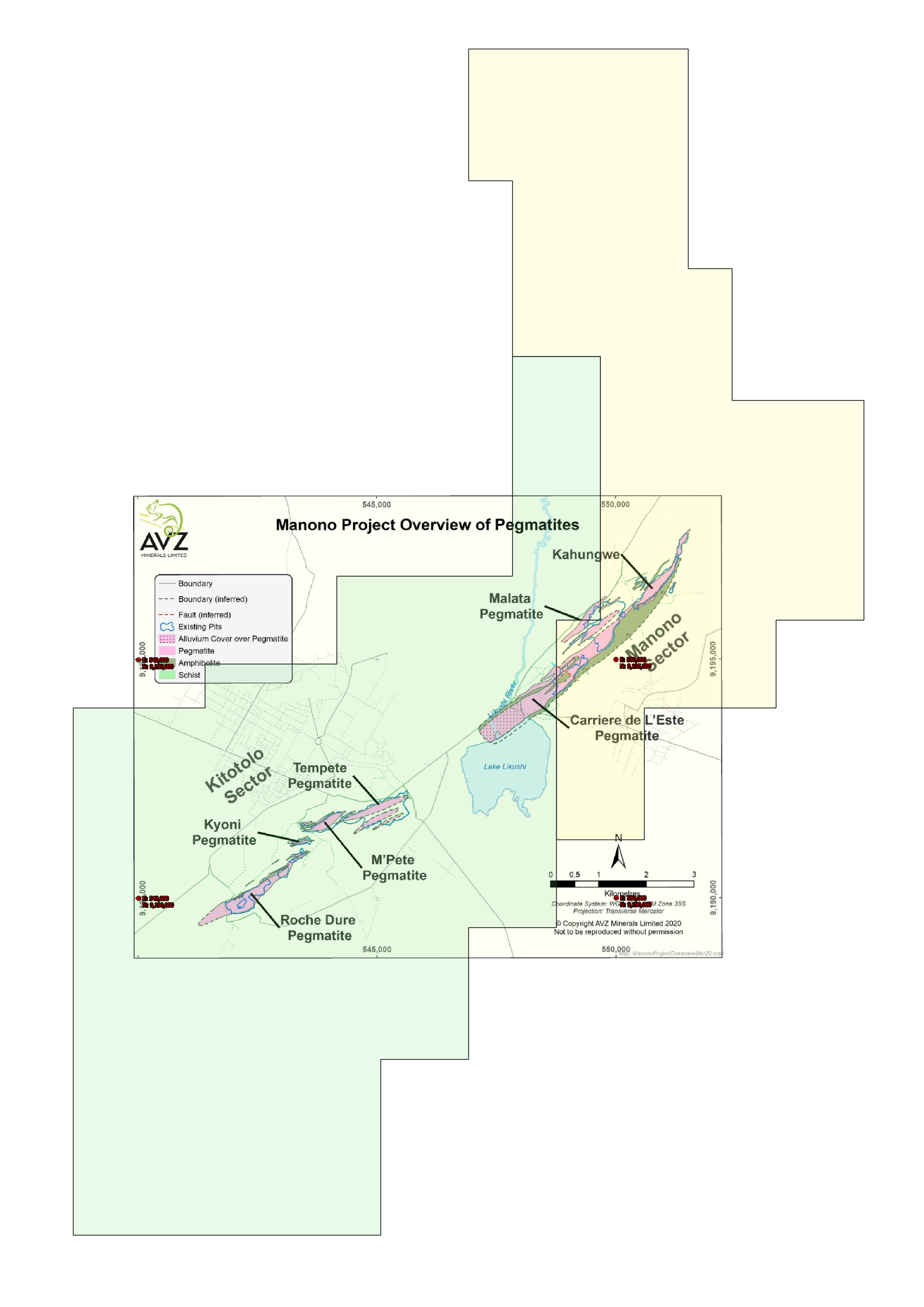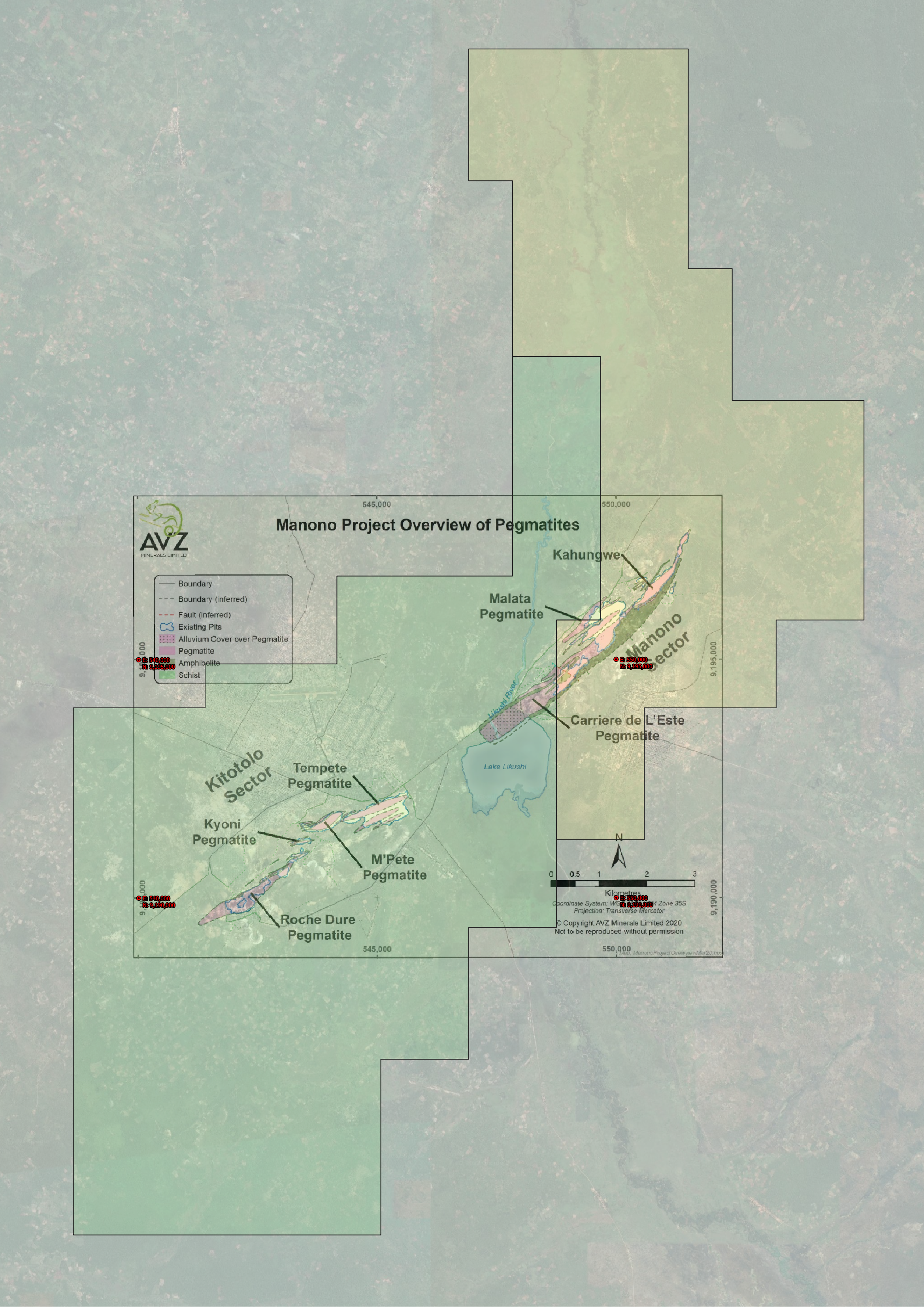 The images below are high resolution, spatially accurate (provided I've not made a dumb error) representations of the north and south sections of 13359 overlaid on a map of our project. The pegmatite map was obtained from page 46 of the DFS and has been modified to remove green shading which made it hard to see what was going on, especially when overlaying the aerial. No other modifications were made to the image. It is copyright AVZ but used here as "fair use" on the grounds that: