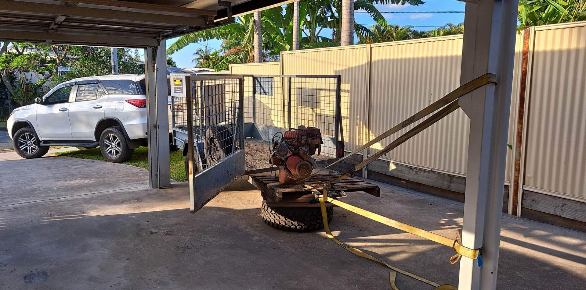 Full credit to my Mrs for driving the car and trailer out from under it after I ratchet strapped it to the house.