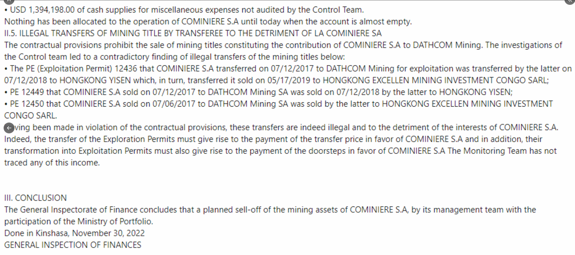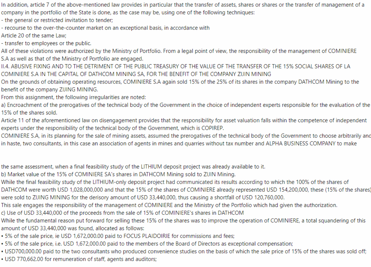 However the part about Dathomir selling 60% to AVZ which it says is illegal essentially after violations of the provisions of the JV contract, this did concern me a little at first read. But if taking the report in its entirety one would realise that the report is about crooks breaking the law for their own benefit and looting from the DRC. Its focused-on laws being broken and by who, we are just the customer who brought a raw tenement.