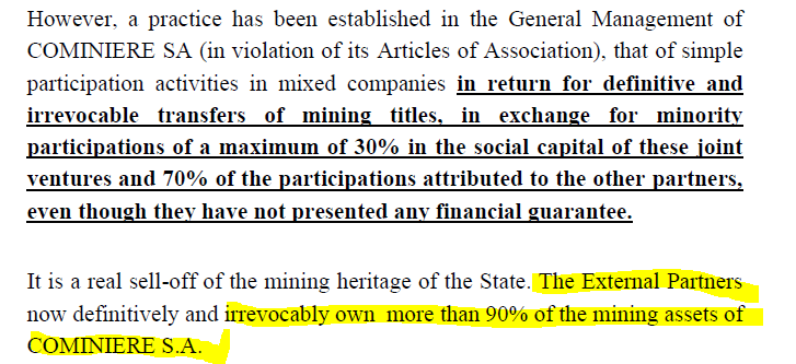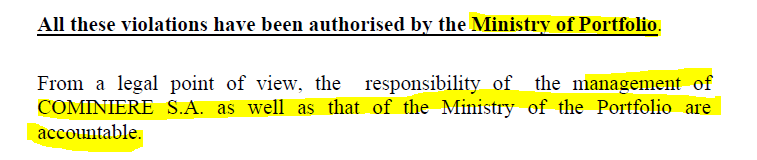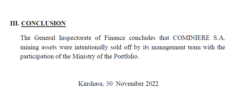 The conclusion of the report is that COMINIERE S.A. mining assets were intentionally sold off by its management team with the participation of the Ministry of the Portfolio.
