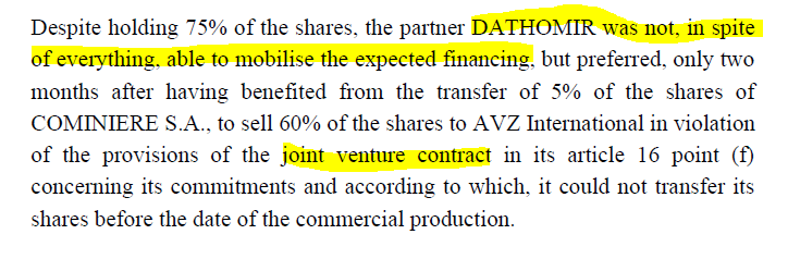 Hi Mickey, the report said the sell 60% of the shares to AVZ International in violation of the provisions of the joint venture contract in its article 16 point (f) concerning its commitments and according to which, it could not transfer its shares before the date of the commercial production.