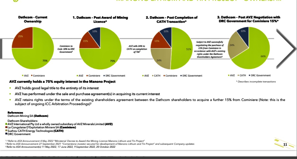 AVZ acquired a 60% in the Licences from the current interest holders La Congolaise D’exploitation Miniere SA (Cominiere) and Dathomir Mining Ressources SARL (Dathomir) whereby AVZ paid Dathomir A$500,000 in cash. The interests of the parties in the Licences are AVZ 60%, Cominiere 30% and Dathomir 10%. AVZ is responsible for funding expenditure to completion of a feasibility study. AVZ can relinquish its interest in any of Licences at any time.