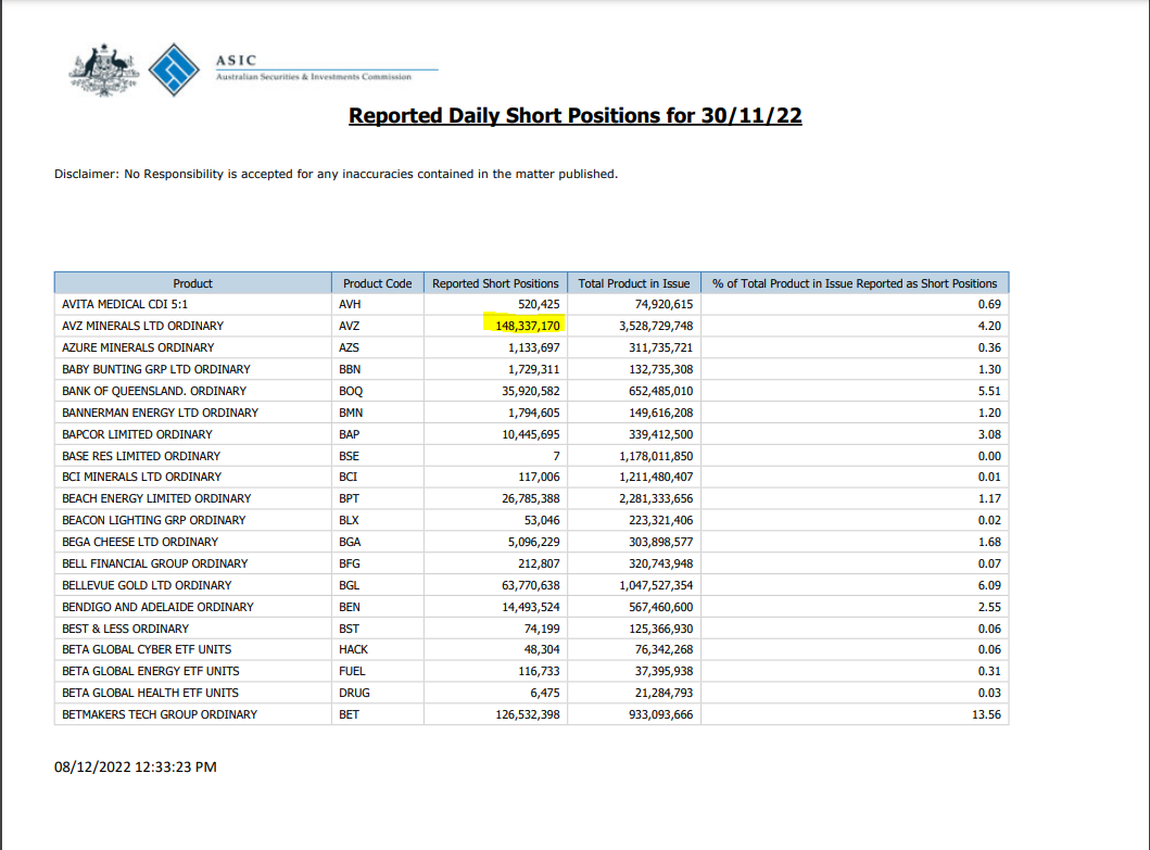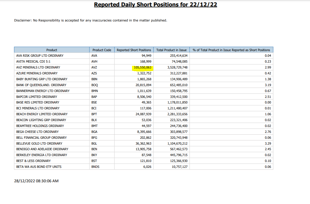 I wonder if the driver of this shift in sentiment is simply economic pragmatism based at least partly on AVZ's decision to go to the International Chamber of Commerce (ICC) to arbitrate on ownership of the Manono project. Since the ICC cases are expected to take months to prepare and finalise, shorters' are reluctant to have their capital and paper profits further tied up during this lengthy process. In other words, it's not so much a vote of confidence in AVZ, but simply the need to have their capital available and continuously working for them. It's not working while tied up in a suspended stock.
