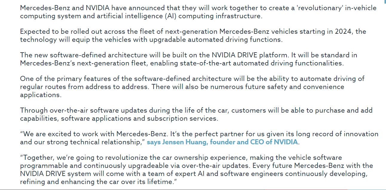 Mercedes would have known about BRN for a while, so the article below (and the partnership between Merc and NVIDIA) I reckon floated round about the time Mercedes decided BRN was a winner. NVIDIA helps with the software integration with BRNs tech, everyone wins.