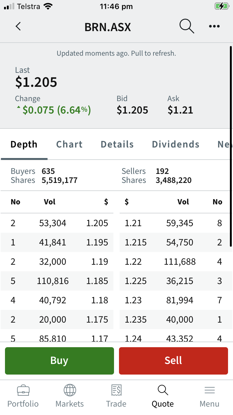 The trade could be innocent and just an "odd" Broker trade for some obscure reason ...............or it could have been an easy way to "slow" or drop the SP which is exactly what happened immediately after as some freaked out. The SP dropped 2c. Then recovered which shows the strength of BUYING in BRN.