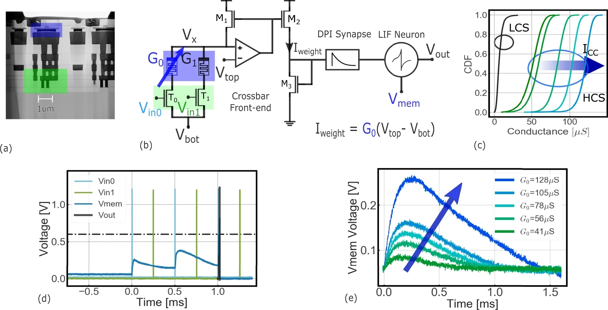 Figure 1: The role of RRAM devices in neuromorphic circuits: (a) scanning electron microscopy (SEM) image of an HfO2 1T1R RRAM device, in blue, integrated on 130–nm CMOS technology, with its selector transistor (width of 650 nm) in green; (b) basic building block of the proposed neuromorphic circuit; (c) cumulative density function of the conductance of a population of 16–Kb RRAM devices, as a function of the compliance current ICC, which effectively controls the conductance level; (d) measurement of the circuit in (a); (e) measurement of the circuit in (b). (Source: “
