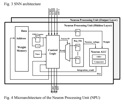 Each neuron in the same layer triggered by the same presynaptic neuron, is processed one-by-one in a Time Division Multiplexing (TDM) manner. The sequence of the operations and data flow are managed by the state machine in the Control Logic block. As shown in Fig. 5, to handle the worst case of back-to-back spikes from the hidden layer, 9 cycles of delay are added after each spike fire event of any neurons in hidden layer to allow sufficient time for the 9 cycles needed by TDM process of 8 neurons in the output layer.