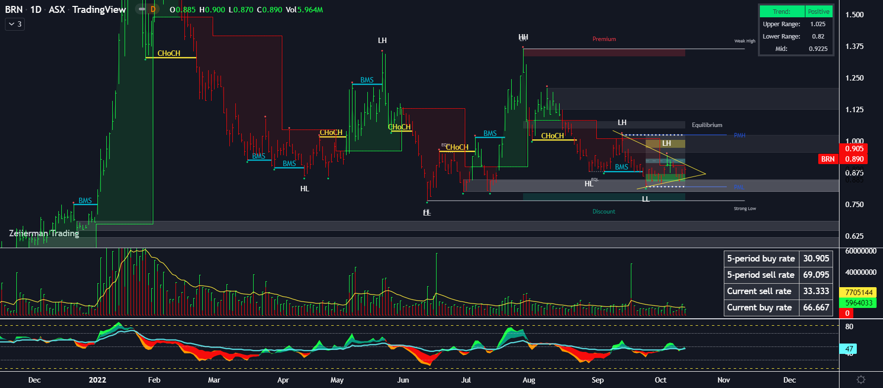 Sitting into the midpoint range now (bluish zone) and will notice the 90.5 that was prev red is now green. This is the monthly pivot bias & will change colour on a price break of the value. Will also reset level each month. The bottom indicator is an RSI version and relatively neutral at the mo. Like a bit more push up in value.