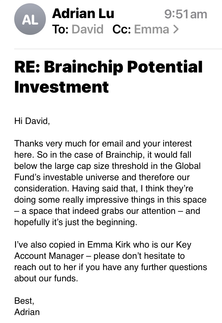 In other words they're waiting for the rebalance?I emailed the Enterprise Software and Semiconductor Manager at Magellan about Brainchip checking if we are on their radar. As per below we are currently too small cap wise, but they are certainly aware of us.