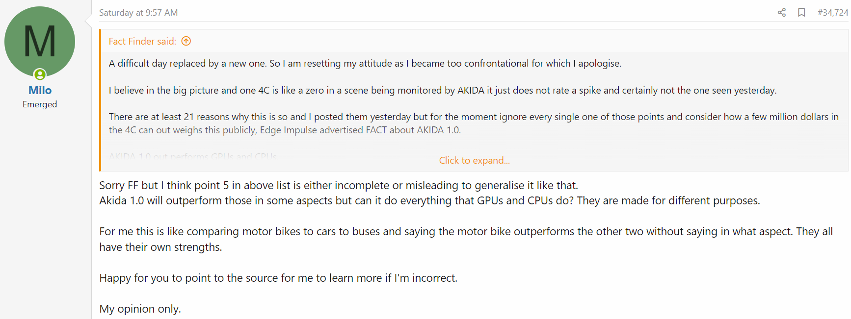 “But I don't believe that and think GPUs are still required in cars in addition to Akida.” was my opinion to the question I asked you in my reply to you. In your reply you quoted Peter but what he had said was he needed 100 Akida1000 chips. Again this makes the original claim unbalanced and does that mean 100x AKIDA 1.0 out performs GPUs and CPUs? In any case these are big claims and if correct, should be somewhere in company presentations, yet I don't recall seeing this in any of the presentations.