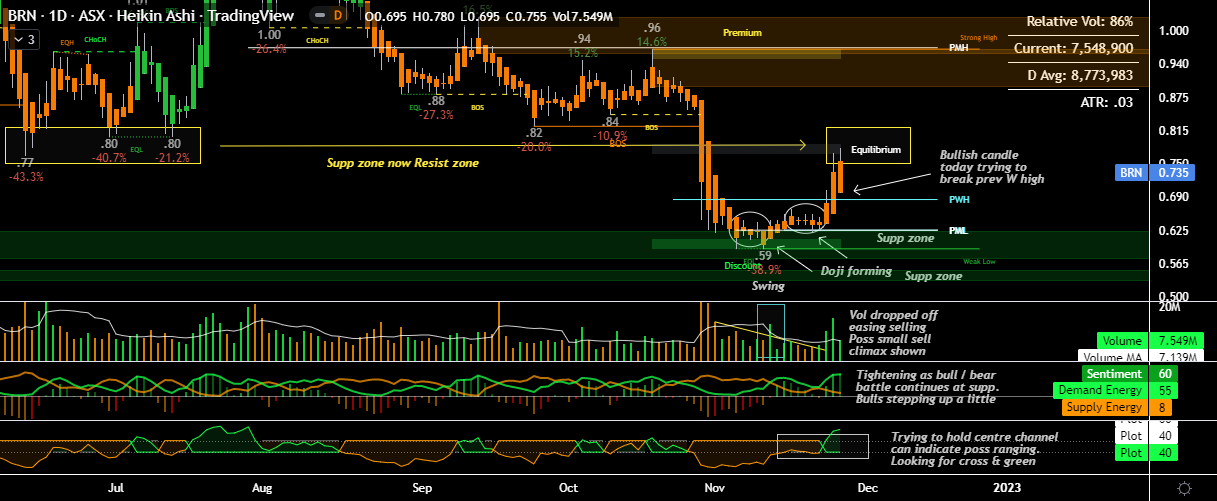 So, currently, the recent HA candles are stronger bullish though wicks a little short as we hit into a poss resist area.