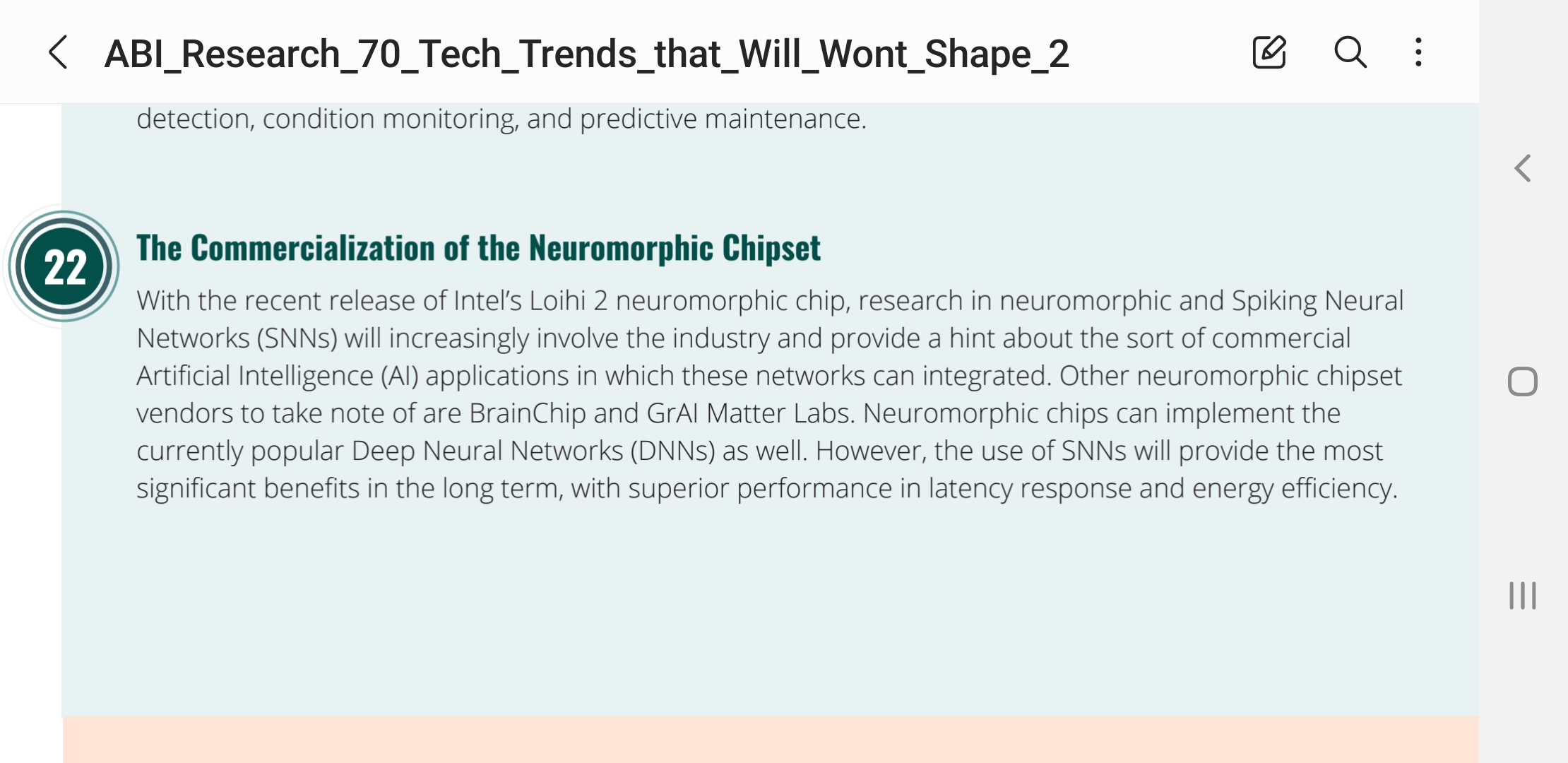 With the recent release of Intel’s Loihi 2 neuromorphic chip, research in neuromorphic and Spiking Neural Networks (SNNs) will increasingly involve the industry and provide a hint about the sort of commercial Artificial Intelligence (AI) applications in which these networks can integrated. Other neuromorphic chipset vendors to take note of are BrainChip and GrAI Matter Labs. Neuromorphic chips can implement the currently popular Deep Neural Networks (DNNs) as well. However, the use of SNNs will provide the most significant benefits in the long term, with superior performance in latency response and energy efficiency.”