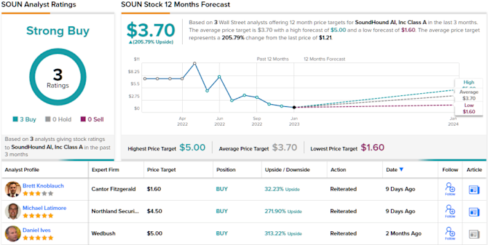 Knoblauch, while bullish on the stock, is somewhat conservative compared to the general Wall Street view here. The average price target is higher than Alexanders, at $3.70, implying a strong upside potential of ~206% from the $1.21 share price. Unsurprisingly, SOUN has a Strong Buy analyst consensus rating, based on a unanimous 3 Buys. (See