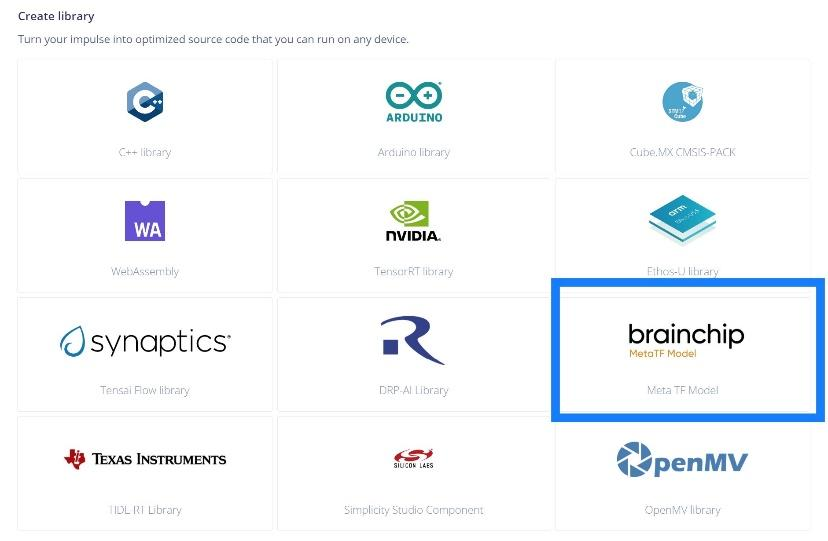 Any model that has been developed in the impulse design on Edge Impulse Studio can be deployed to BrainChip Akida target devices. In order to download these models for custom deployments, developers must choose the BrainChip MetaTFTMmodel block (refer Figure 5a) under the deployment stage to obtain a .zip file with the converted model in it. Alternatively, there is also a BrainChip Akida PCIe deployment block (refer Figure 5b) available which will generate a pre-built binary that can be used with Edge Impulse Linux CLI to run on any compatible Linux installation where this board is installed.