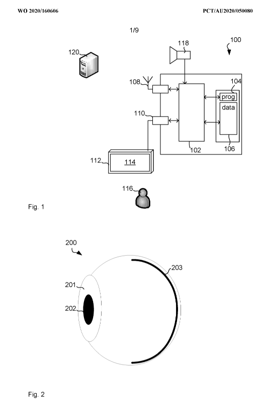 Computer system [46] Fig. 1 illustrates a computer system 100 for diagnostic imaging. The computer system 100 comprises a processor 102 connected to program memory 104, data memory 106, a communication port 108 and a user port 110. The user port 110 is connected to a display device 112 that shows data, such as report with a numeric pathology score or a predictive change map 114 to patient 116. The program memory 104 is a non-transitory computer readable medium, such as a hard drive, a solid state disk or CD-ROM. Software, that is, an executable program stored on program memory 104 causes the processor 102 to perform the method in Fig. 2, that is, processor 102 retrieves at least two images captured by a retina camera 118, such as Nidek AFC- 210, over time, aligns the images and calculates a pathology score based on pathologic features in the images.
