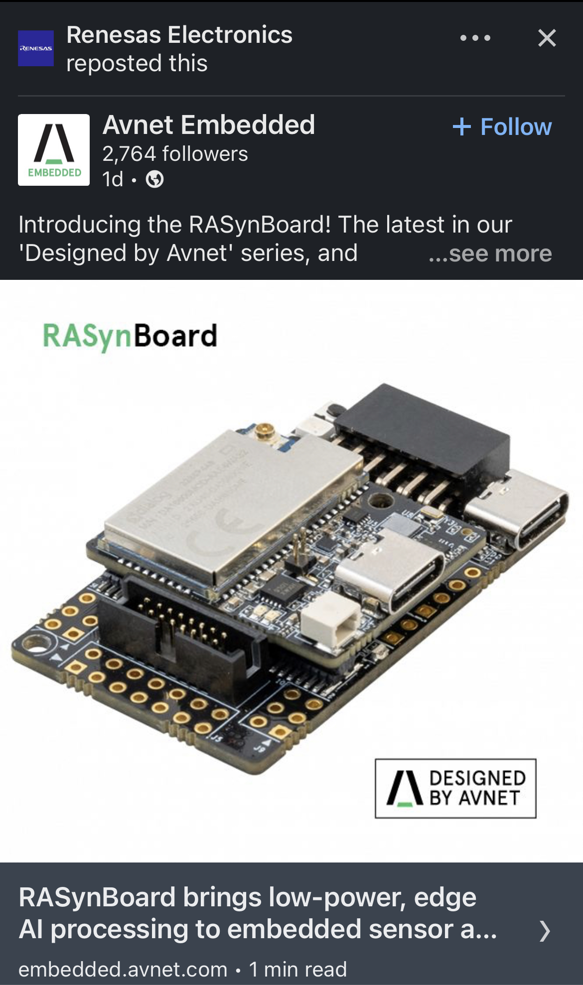 Introducing the RASynBoard! The latest in our 'Designed by Avnet' series, and using the latest components from our partners Renesas Electronics, Syntiant Corp., TDK and Edge Impulse, the RASynBoard is a tiny powerhouse in always-on smart sensing. It can be baked into product designs that need...www.linkedin.com