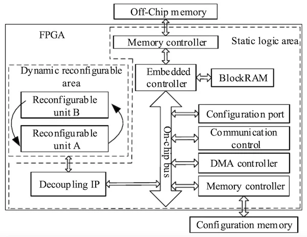 An example diagram showing how FPGAs can be dynamically reconfigured. Image used courtesy of Wang et al