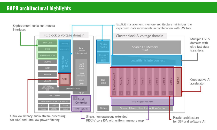 GAP9 is a unique combination of a powerful low power microcontroller, a programmable compute cluster with a hardware neural network accelerator and sample by sample audio filtering unit.