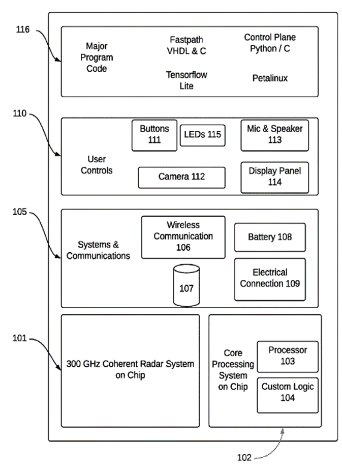 [0024] For example, lens 120 can be a Luneberg lens of the type or types described in U.S. Patent Application No. 63/161,323, the contents of which are hereby incorporated in their entirety. [024] In an embodiment, core processing system 102 includes processor 103 and custom logic 104. Processor 103 is configured to process instructions to render or display images, initiate a scan, process the results of a scan, alert the user, and provide the results of an object match, if any, to the user. Processor 103 can be any of a variety and combination of processors, and can be distributed among various types and pieces of hardware found on the apparatus, or can include hardware distributed across a network. Processor 103 can be an ARM (or other RISC-based) processor. Additionally, such processors can be implemented, for example, as hardware modules such as embedded microprocessors, Application Specific Integrated Circuits (“ASICs”), and Programmable Logic Devices, including flash memory (“PLDs). Some such processors can have multiple instruction executing units or cores. Such processors can also be implemented as one or more software modules in programming languages as Java, C++, C, assembly, a hardware description language, or any other suitable programming language. A processor according to some embodiments includes media and program code (which also can be referred to as code) specially designed and constructed for the specific purpose or purposes. Custom logic 104 can include one or more Field Programmable Gate Array(s) (FPGA) or any type of PLD for custom logic to support processing offload from Processor 103. In an embodiment, the term “processing offload” includes digital signal processing and digital beam forming.