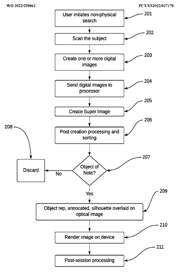 Upon completion of a search, at 211, post-session processing takes place. This processing can include all or some of the following: tagging images or videos with metadata, gathering and uploading metadata, generating a report, providing a digital signature or certificate, archiving, and uploading the data (both received and processed) and metadata. In this step, images can be cryptographically tagged with various metadata and transmitted and stored on the device, or can be uploaded for further processing. If a data repository is used (e.g., a cloud-based database or an online server), the images, videos, and metadata can be stored there. Examples of metadata can include (but are not limited to) time stamps, geolocation data, device data, customer specific information (user, associated visual images), networked or connected devices, voice recordings, and session information. In an embodiment, a web-based service can be implements using public cloud infrastructure and services such as those provided by (but not limited to) AWS, Azure, and GCP.