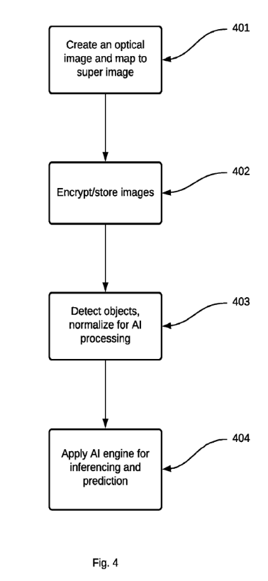 [048] Fig. 4 is a flow chart of a method for processing the existing data to create a final image. At 401, an optical image is created and mapped to the super image creating a filtered image. In an embodiment, the apparatus uses a separate camera to create an optical image used as a base image configured to be mapped to the super image, according to an embodiment. In an embodiment, the separate camera is a digital camera using a CCD sensor, or a CMOS sensor, or any practicable sensor.