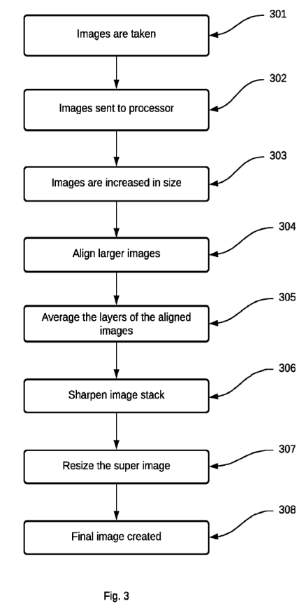 [045] Fig. 3 is a flowchart of a method for creating a dataset of images to be used for imaging and detection, according to an embodiment. At 301, one or more images are taken. At 302, the images are sent to a processor for processing. The image or images received at the processor are increased in size by a predetermined amount creating a set of larger images, at 303. In an embodiment, the images are increased in size to achieve finer blending of the image stack in order to extract the high frequency data that is embedded in the low frequency data hidden in the aliasing.