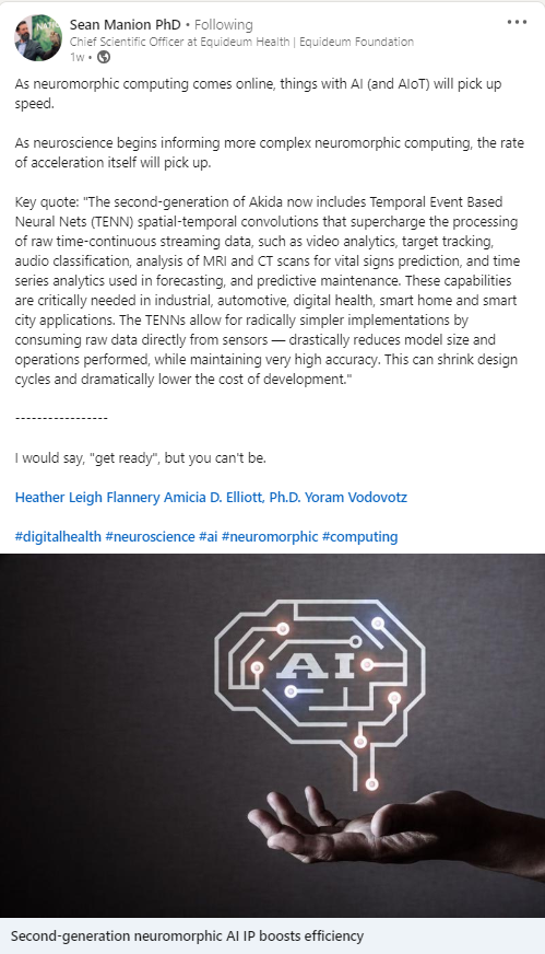 As neuromorphic computing comes online, things with AI (and AIoT) will pick up speed. As neuroscience begins informing more complex neuromorphic computing, the rate of acceleration itself will pick up. Key quote: "The second-generation of Akida now includes Temporal Event Based Neural Nets...www.linkedin.com