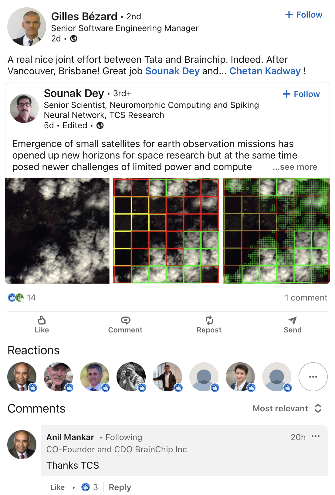 The social media post regarding Tata and BrainChip working together, in my opinion, shows there is interest in BrainChip's technology and that well-known entities are working with it. As far as I know, BrainChip's involvement has been a support role in providing educational materials or technical support in integrating their IP with Tata's solution.