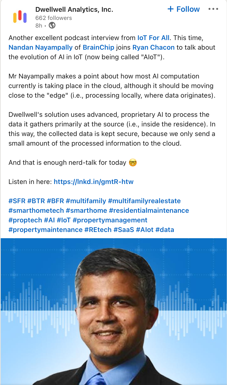 “We work with start-ups whose solutions will benefit real estate professionals across all sectors. Dwellwell’s unique proptech platform, leadership team, and success to date made them a natural match for our program,” noted