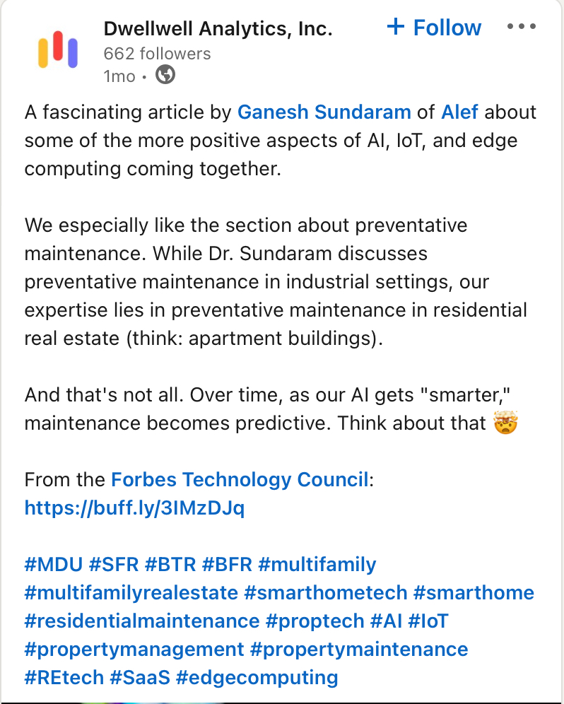 Dwellwell’s innovative, industry changing smart home product delivers comprehensive diagnostics for the entire home. The SaaS platform helps institutional property owners better understand the overall health of their rental properties and avert costly catastrophes like fire, HVAC failures, and flooding. Combining patent-pending, multi-sensing technology and artificial intelligence, Dwellwell identifies maintenance issues as soon as they arise ‒ and ultimately predicts issues before they occur.
