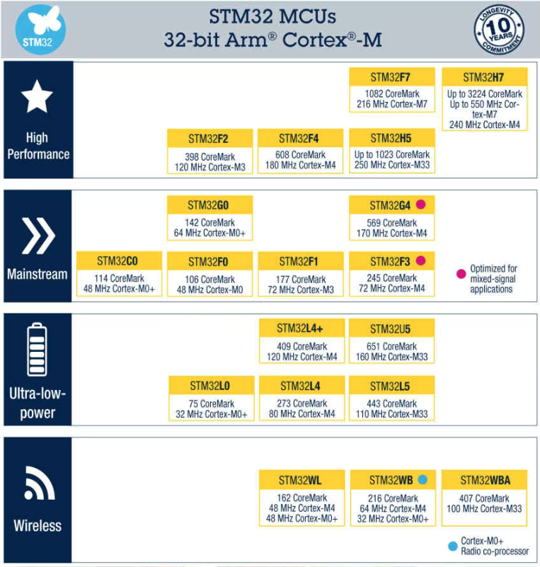 Also I think of STM32 MCU's from Arm, and they have various models depending on requirements.