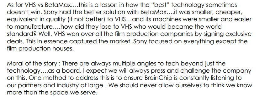 I don't think the betamax analogy applies. Betamax was a consumer product where technical capability is not the foremost consideration. Licensing IP for SNNs is a different kettle of fish where technical capabilities are paramount. SNN IP customers are not going to buy a product because it does not clash with the aspidistra.On darker days I think excatly that... We have the best product, that I am convinced about. But then we also had Betamax vs VHS. Betamax was definitly the better product. And yet...