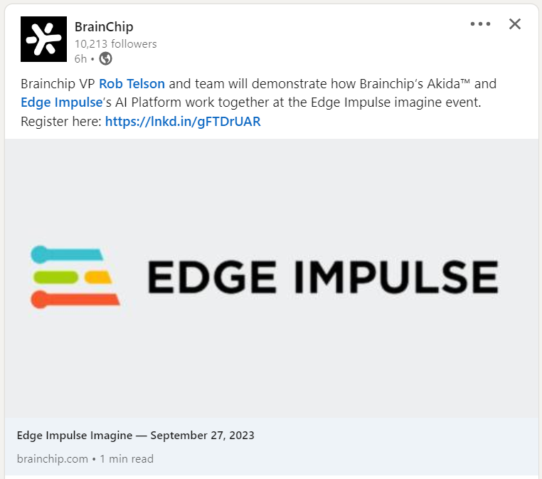 It is good however that it's involved with Edge Impulse as they are obviously a valuable Ecosystem Partner for Brainchip.