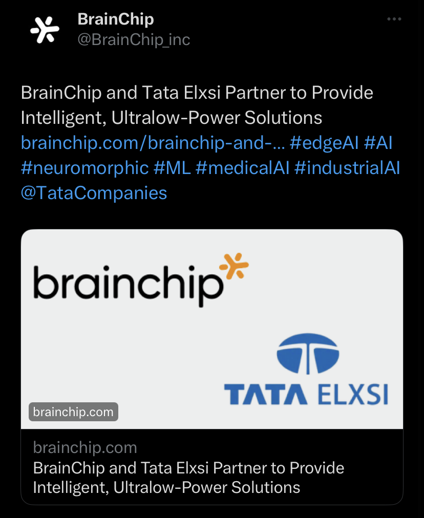 Well done Brainchip. It's is my opinion this is massive, it's a foot into the TATA Group. Brainchip has work with TATA Consulting Services and now a formal partnership with TATA ELXSI.