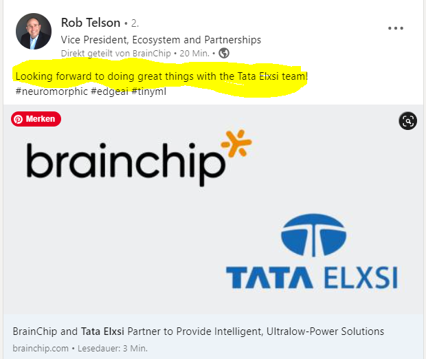 Incredible validation of AKIDA here from the CEO of Tata Elxsi. I think this is significant coming from our new partner. They must have been working with AKIDA for some time based on that last sentence.