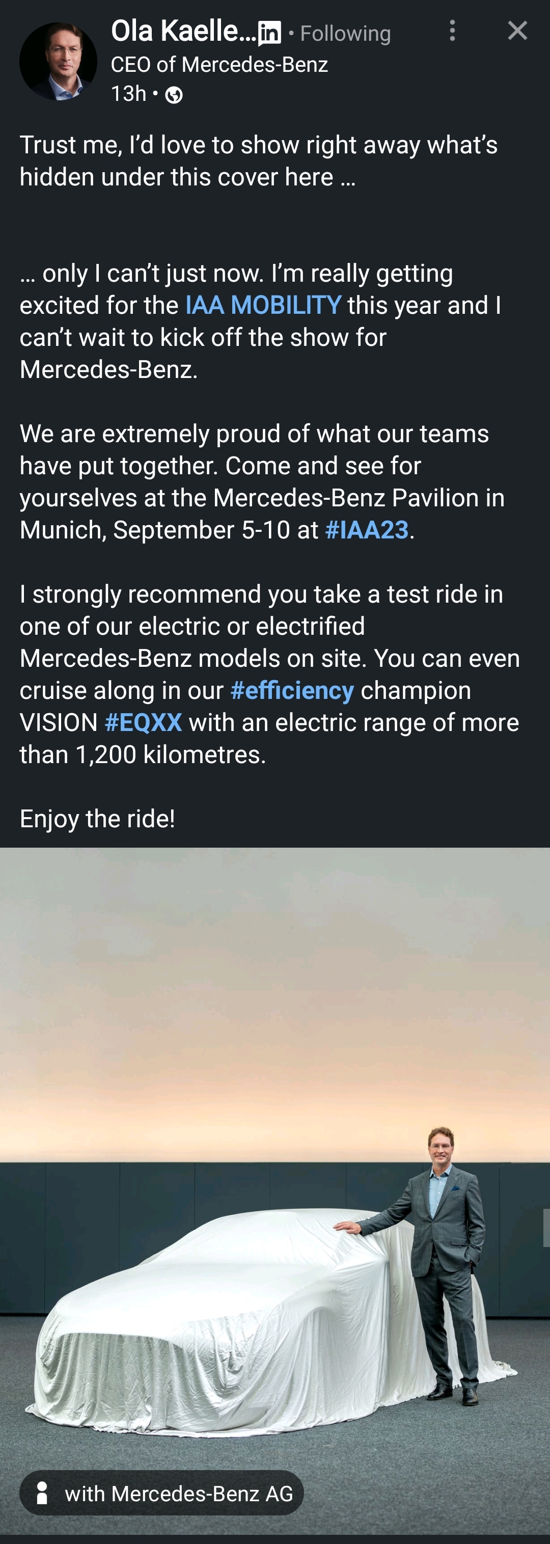 Even nicer if AKIDA is in there. Not a single mention of neuromorphic tech in the article, but it is all a bit vague. At 30% more efficient than Volvo perhaps Merc are keeping the secret sauce very secret. We'll know soon.Mercedes-Benz Concept CLA Class is huge tech in a small, bright package - Autoblog