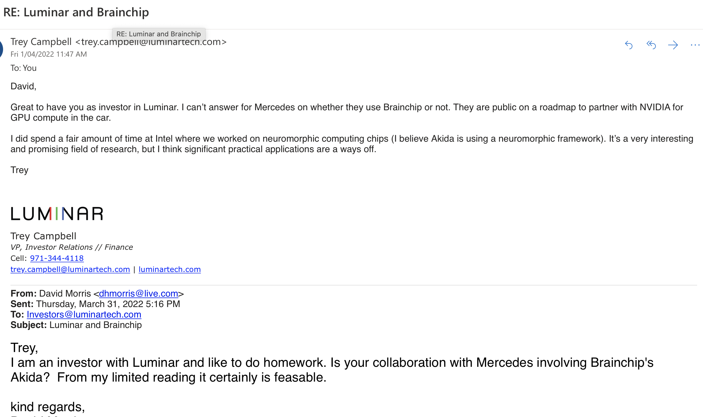 I do not know who Trey is at Luminar but if Luminar is trying to corner the Mercedes Benz Lidar use market, as is clear they are, then I cannot believe that they have not read most if not everything there is to know about Mercedes and the EQXX and in so doing stumbled across the fact it was using neuromorphic computing in some form. The reference to Mercedes being in bed with Nvidia for its GPU is an attempt at slight of hand as the GPU is not neuromorphic compute.