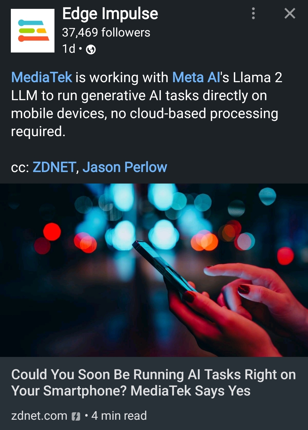 MediaTek is working with Meta's Lllama 2 LLM to run generative AI tasks directly on mobile devices, no cloud-based processing required.