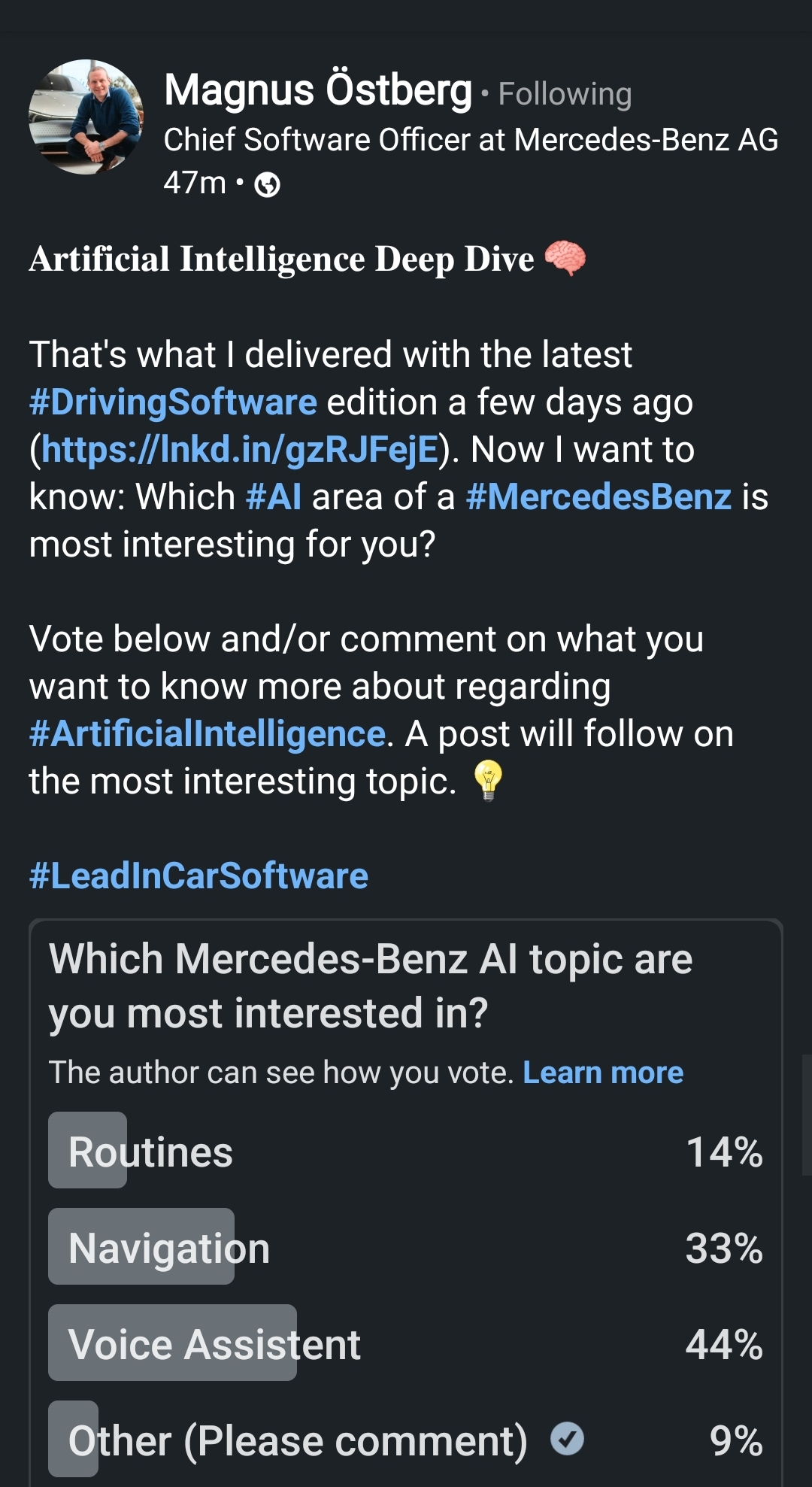 #drivingsoftware #ai #mercedesbenz #artificialintelligence #leadincarsoftware | Magnus Östberg | 101 comments