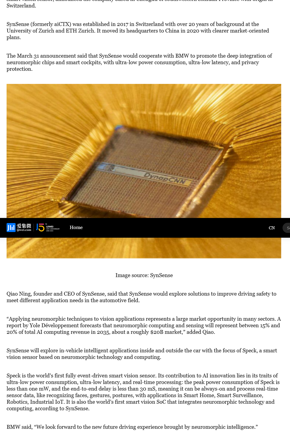 FYI, SynSense’s website still lists BMW as a partner under ‘Industry Ecology’.