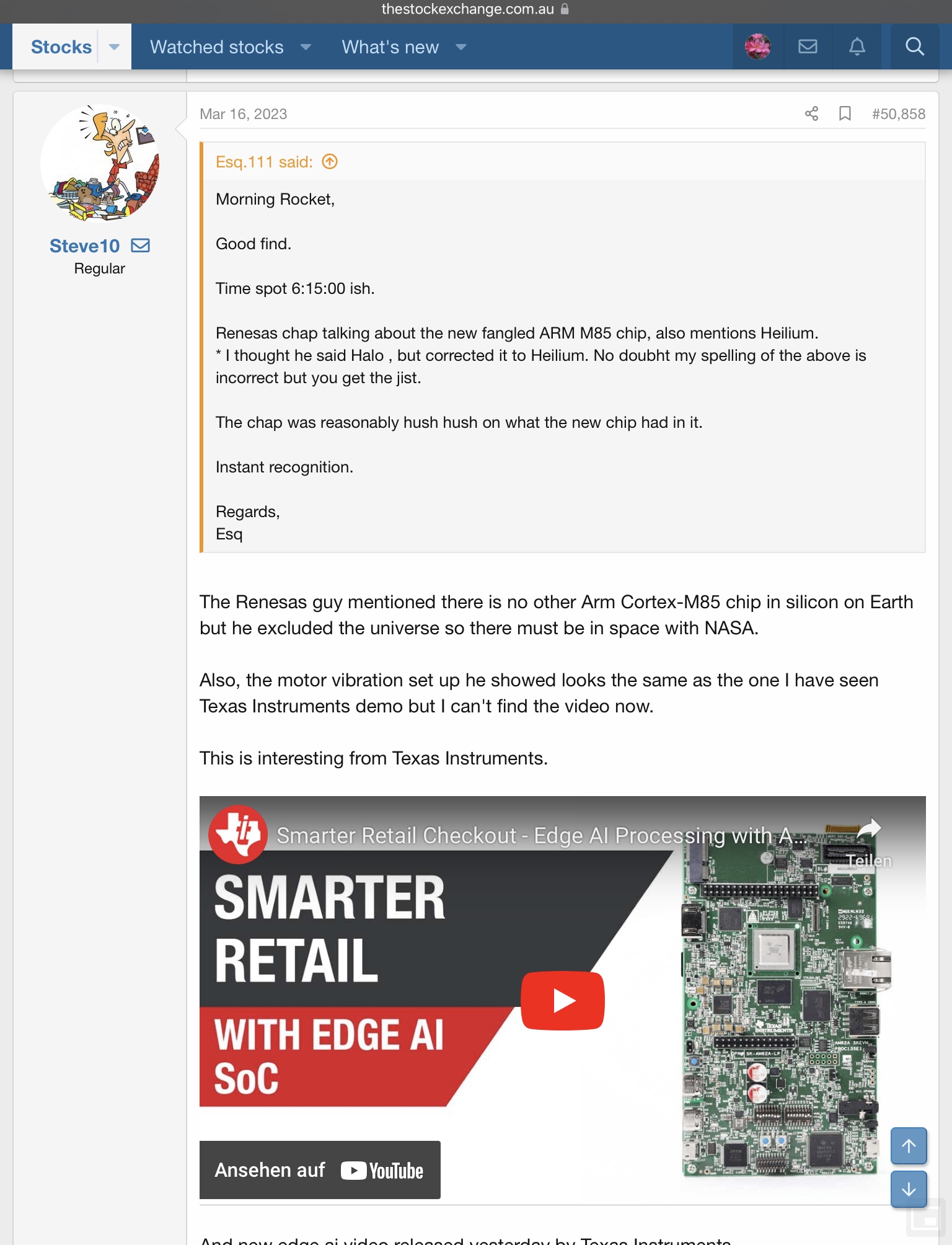 Just like @Steve10, I believe Bernd Westhoff, Director of Microcontroller Product Marketing at Renesas - while doing his best in promoting the MCU with its instant AI experience they had just launched by the time this video at Embedded World 2023 was recorded (“the latest and greatest you can get right now”) - must have been very much aware of the fact that the first time ever the Arm Cortex-M85 had been used in conjunction with AI was in space (so most likely NASA). (Mind you, I don’t have any proof of this, but to me this is the only way his reaction makes sense).