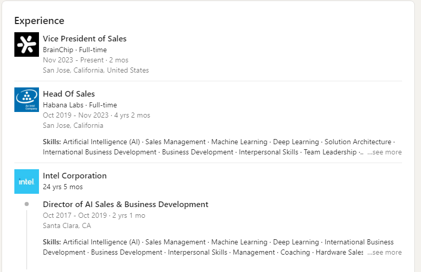 This sure sounds like Brainchip has snagged a really big fish. And he ....Mr. Thorne....must really believe that Brainchip has something really big to sell...to entice him to exit the Intel cocoon after so many years.