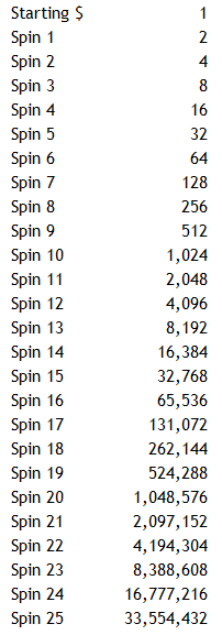 So what I gather from this is if I take $1 to the Casino each day and try to guess the colour on roulette 25 times in a row I can turn $1 in to $33M.
